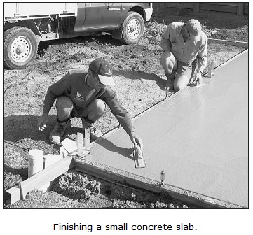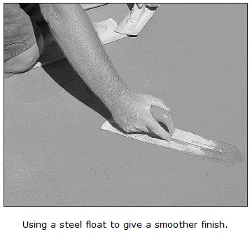 This photograph shows the concreter using a pointed steel float (sometimes called a flooring trowel) in the last stage of floating.