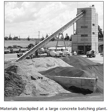 Look at the second photo in this unit and you will see a concrete truck about to enter the batching plant, where measured amounts of materials are loaded into the truck’s mixing drum. The drum is then rotated to mix the concrete.