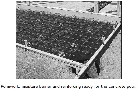 The photograph above shows the formwork, moisture barrier and steel reinforcing prepared for a similar type of slab.