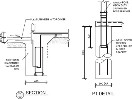 External slabs should never be perfectly level. They should have a slight slope to run the water off. Section C-C shows that the carport slab falls away from the cottage. For this job the forms could be set up with 40 to 50mm fall in the width of the slab.