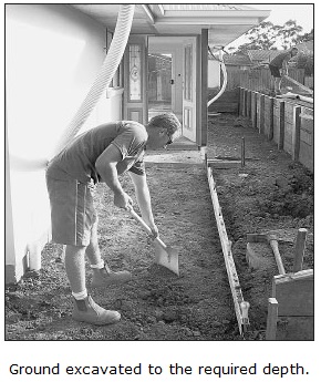The hole has been made wide enough to allow for the formwork and deep enough for a layer of fine crushed rock to be spread as a base for the concrete and to level out the subgrade.