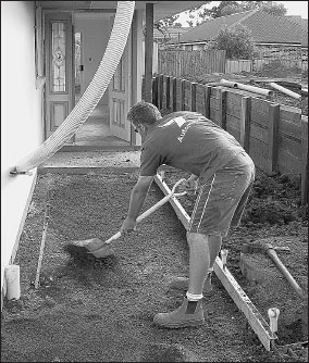 He is also forming the surface of the concrete, working to a chalk line on the timber retaining wall.