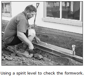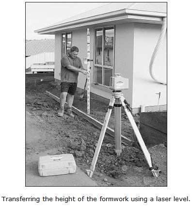 The worker in the photograph on the left is using a laser level to transfer the height of the formwork. Below he is using a spirit level to check that the formwork is level.