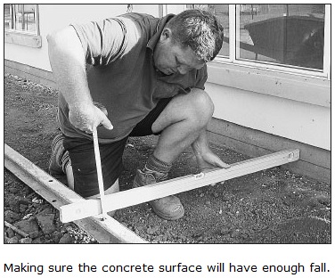 The formwork has been set up to give the surface of the concrete about 20mm fall so that rain water will run away from the cottage.