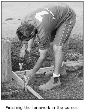In the photograph on the left the construction worker is using a piece of timber to complete the formwork in the corner.
