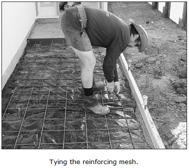 The reinforcing mesh is cut with bolt cutters to fit inside the formwork. Pieces of mesh should overlap each other and be securely tied with wire ties to prevent movement of the mesh during the concrete pour.