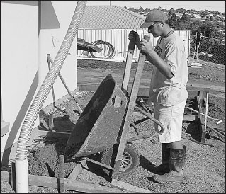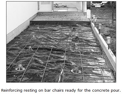 The photograph above shows plastic bar chairs supporting the reinforcing mesh. Have another look at the Footing Details on page 159 for minimum side and bottom cover for reinforced footings and beams.