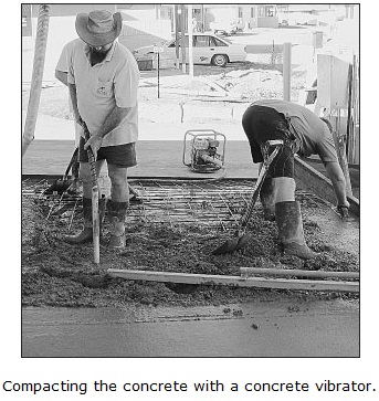 The photograph on the right shows the construction worker using a concrete vibrator to compact the wet concrete.