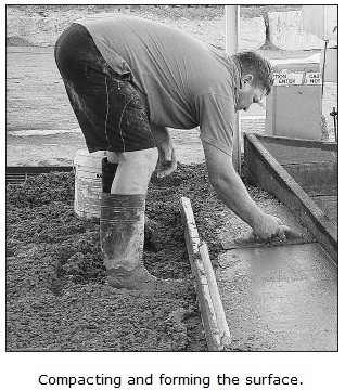 This photograph shows the concreter using a screed to straighten out the concrete, working to the surfaces formed on each side.