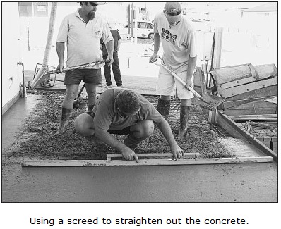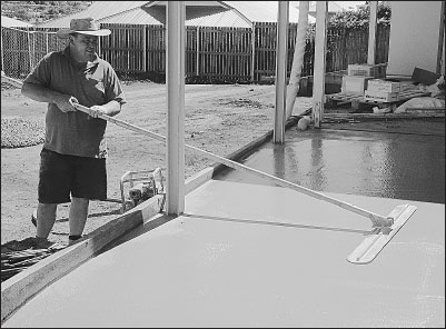He moves the screed from side to side as he drags excess concrete away from the formed surface.