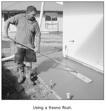 This photograph shows the concreter using a fresno float in the first stage of finishing the concrete surface.