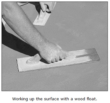The photograph on the right shows the concreter using a wood float in a continuous circular motion.