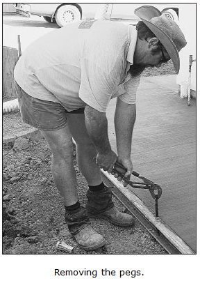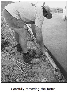 When you are stripping steel forms or edge boards you must be very careful not to damage the edges or surface of the ‘green’ concrete.