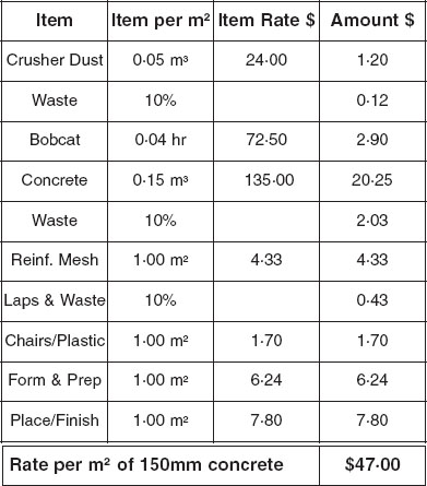 The Amount column shows the cost per square metre of each item. The total at the bottom is the cost or rate per square metre of finished concrete. The cost of the concrete driveway in our example is found by multiplying the number of square metres by the rate per square metre, (144 x $47 = $6,768).