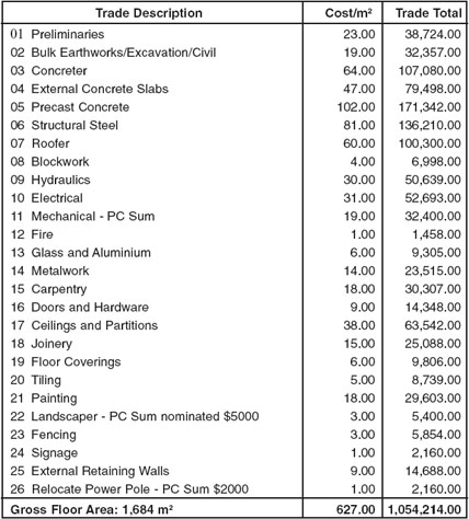 Note that the item costs have been brought down to a cost per square metre of gross floor area rounded to the nearest dollar. The overall cost per square metre is $627. These figures can be used when costing similar buildings or to compare estimates for similar buildings. Note also that a number of the cost items in the summary would be quotes from subcontractors.